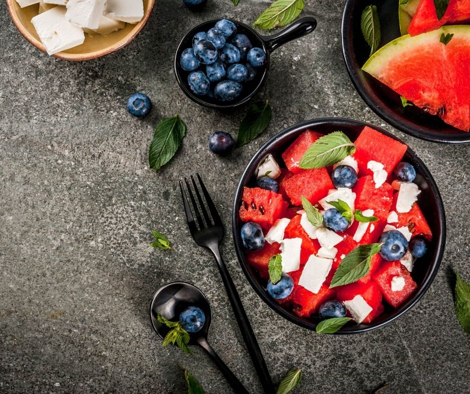 • In a large salad bowl, add watermelon, blueberries and mint leaves. Top with oil, balsamic vinegar, salt and pepper and mix well.