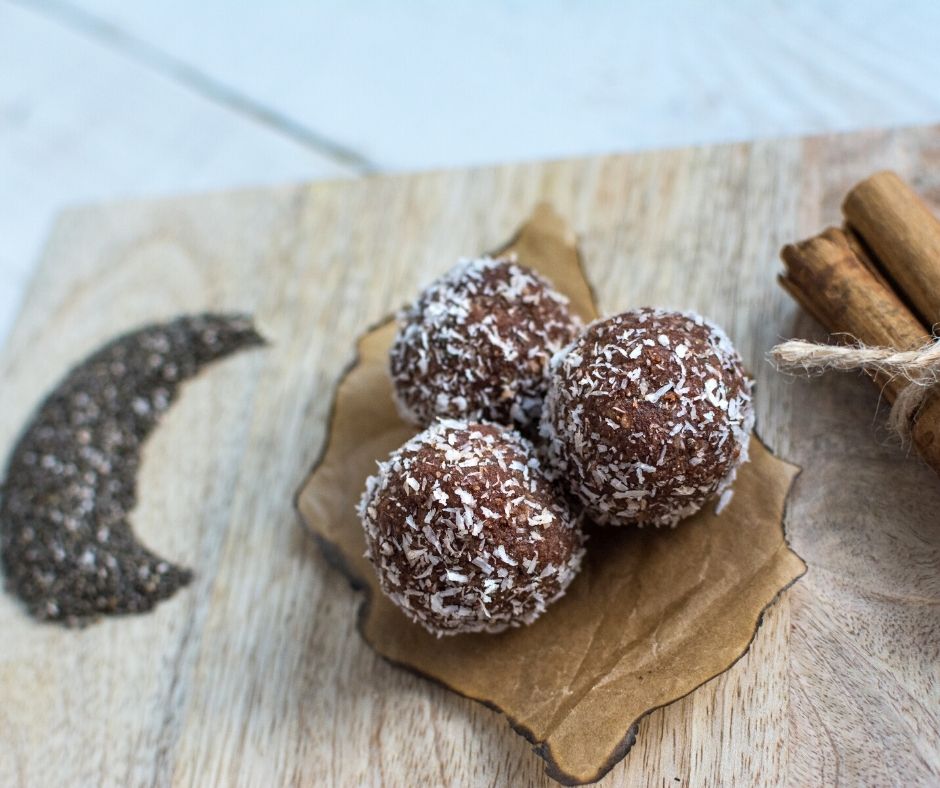 - In a food processor mix all ingredients well. Form balls with a spoon and roll them in coconut flour! Leave the balls in the fridge to cool a bit.