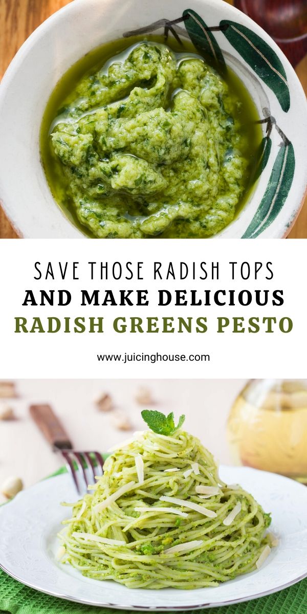 Radish greens are completely edible and their texture is perfect for a pesto sauce. I like to make a batch and freeze it for whenever I am making pasta, or chicken, or potatoes, or you can even put it in a salad as a salad dressing!