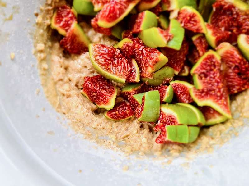 - Chop the figs into cubes and add them to the mixture last. Do not mix with a mixer but with a spoon to stay whole.Pour the cake into a baking tray, that you have previously coated little with coconut oil so that it does not stick when taken out. You can also bake on parchment paper. My tray was a cube measuring 9x9 inch.Bake it for 10-15 minutes at 350˚F and then for another 10 minutes at 320˚F.