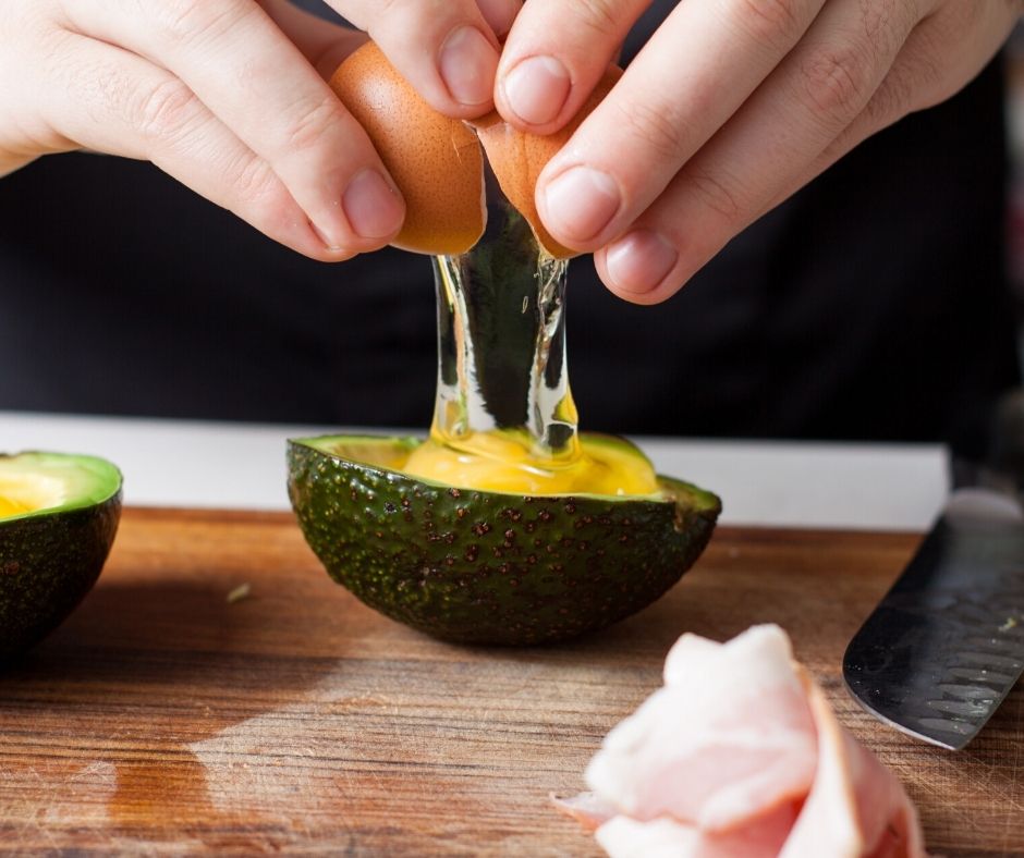 - Crack the egg directly in the avocado half. Season with salt and pepper. Repeat with the rest avocados and eggs.